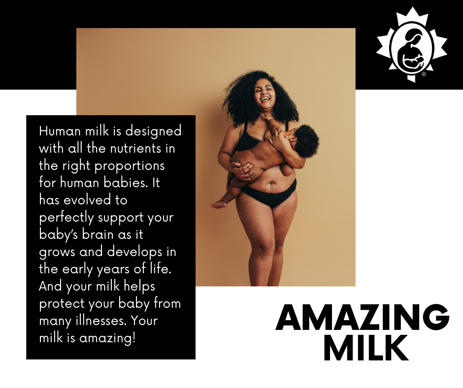 Your milk is amazing. It’s just what your baby’s body needs. It provides the food your baby needs to grow and the immunity your baby needs to stay healthy. Your milk is important for your baby.