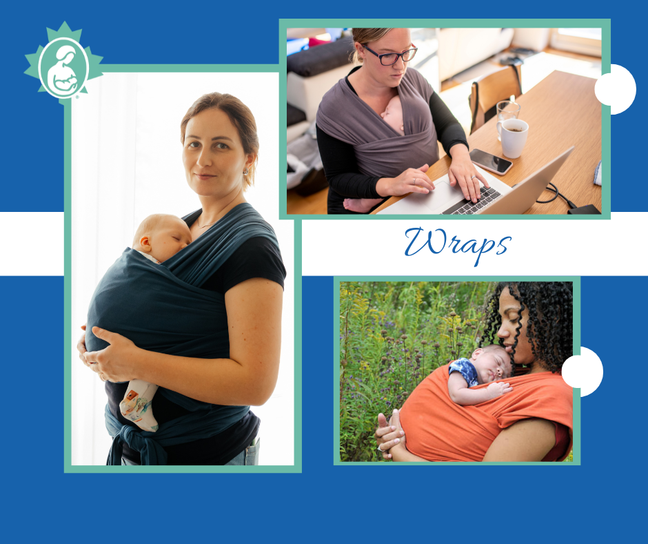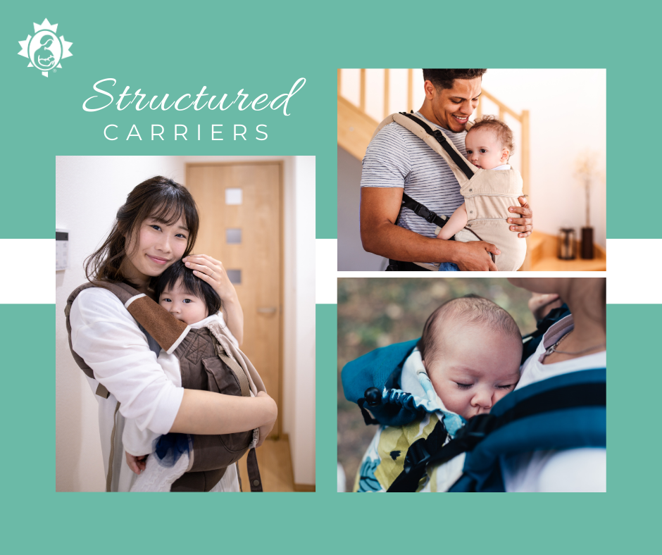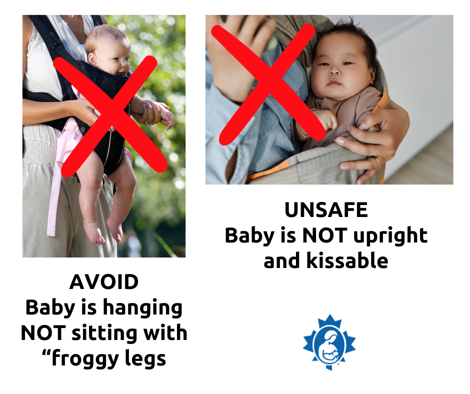 There are several different kinds of baby carriers including ring slings, wraps, and structured carriers. It is important to use a carrier that supports your baby’s proper hip development. Your baby should sit in the carrier with his weight on his bum. His legs should be in a “froggy” position with his knees slightly higher than his bum. Carriers in which the baby hangs from his pelvis should be avoided. It can be helpful to practice when your baby is awake and calm.