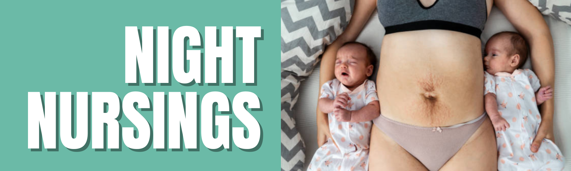 You may find night nursings easier if you learn to nurse lying down. The position you find works best for you will likely depend on the size of your babies, your breasts and the length of your arms. You can nurse your babies one at a time or together, while reclining, lying nearly flat on your back or lying on your side. See Positioning and Latching. You can also get some ideas from the photos here or by contacting a La Leche League Canada Leader.